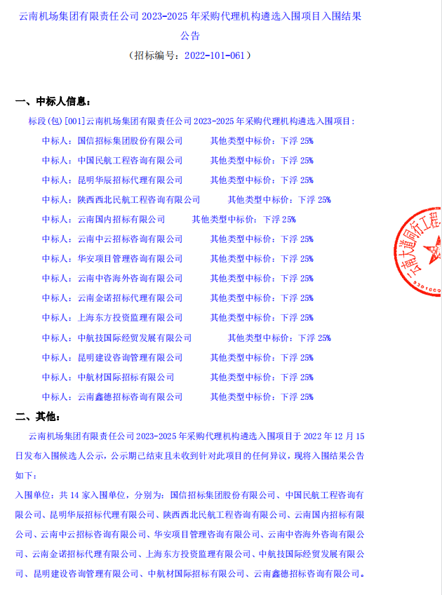 2022年12月,云南機(jī)場(chǎng)集團(tuán)有限責(zé)任公司開(kāi)展新一輪的采購(gòu)代理服務(wù)機(jī)構(gòu)入圍比選,國(guó)信招標(biāo)集團(tuán)股份有限公司云南分公司(以下簡(jiǎn)稱(chēng)“國(guó)信招標(biāo)云南分公司”)憑借多年來(lái)的優(yōu)質(zhì)服務(wù)能力和過(guò)硬的專(zhuān)業(yè)技術(shù)團(tuán)隊(duì),代表國(guó)信招標(biāo)集團(tuán)再次入選為云南機(jī)場(chǎng)集團(tuán)有限責(zé)任公司2023-2025年采購(gòu)代理服務(wù)機(jī)構(gòu)。