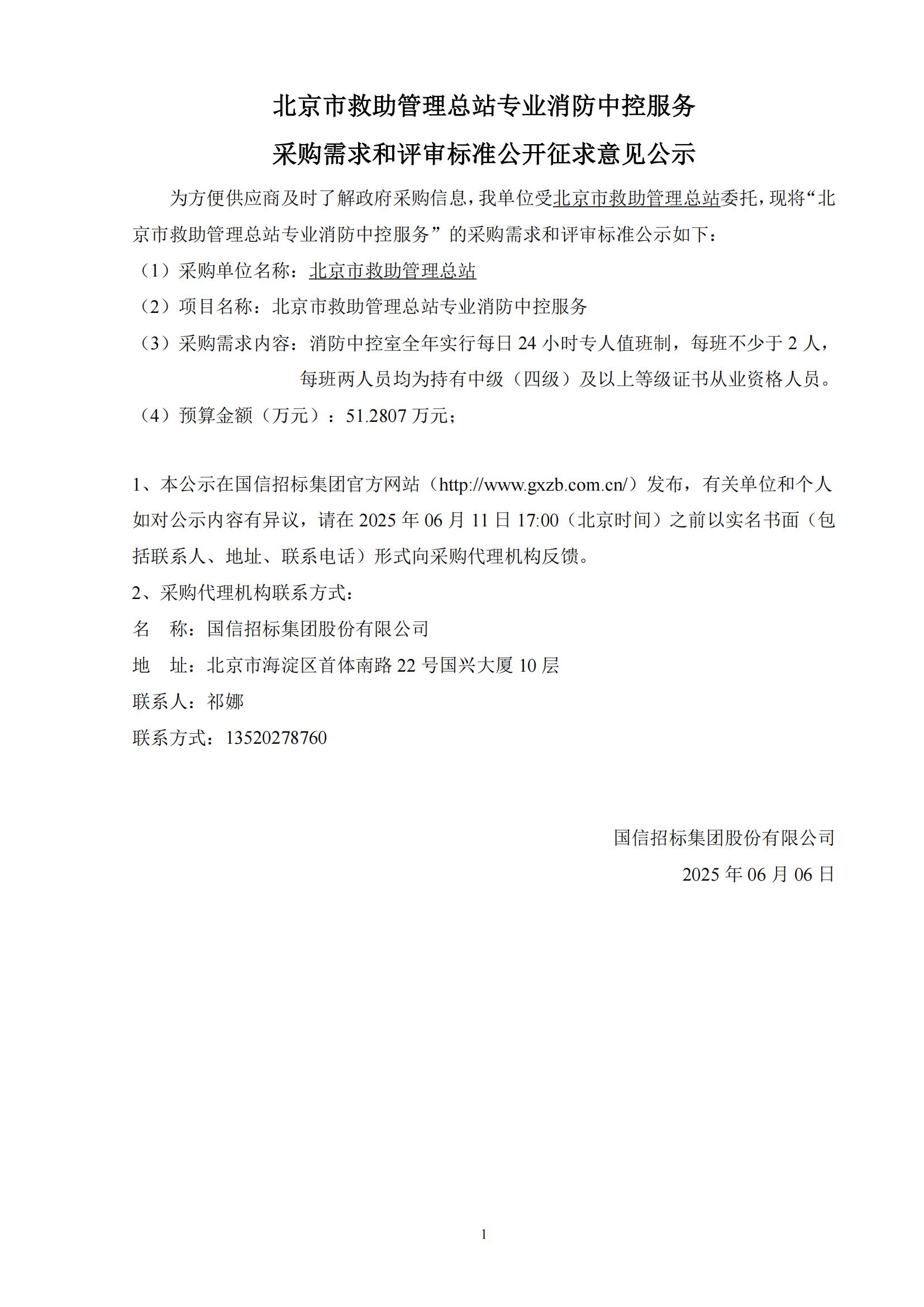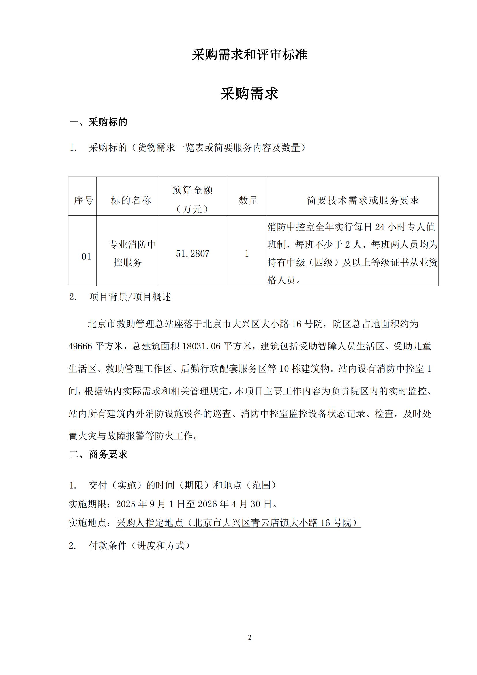 采購需求和評審標(biāo)準(zhǔn)公示版——北京市救助管理總站專業(yè)消防中控服務(wù)06.06發(fā)布